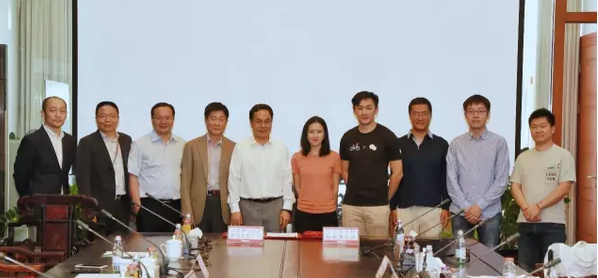 汉能控股集团董事局主席李河君(左5)摩拜单车创始人兼总裁胡玮炜(右5)出席签约仪式