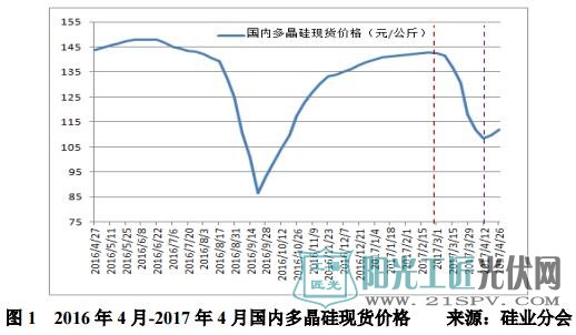 2017年3-4月份多晶硅价格跌宕起伏,从进入3月开始价格骤然下滑,从3月初的14.25万元/吨一路跌至谷底10.85万元/吨,跌幅达到23.9%,随后触底反弹,连续两周微幅回升,截止4月底,周均价回升至11.2万元/吨,涨幅为3.2%。
