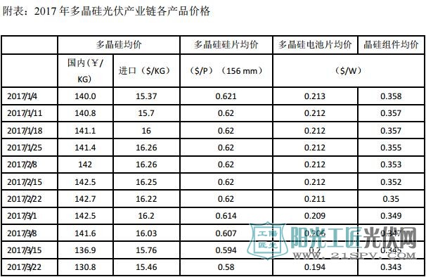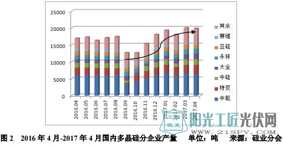 硅业分会统计,截止2017年4月底,国内在产多晶硅企业17家,有效产能共计23.7万吨/年,产能在逐步提升,3-4月份的产能增量主要来自新特能源、新疆大全、四川永祥。根据在产多晶硅企业的扩产进度来看,截止2017年中,国内多晶硅年产能将达到25万吨/年左右。