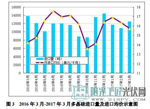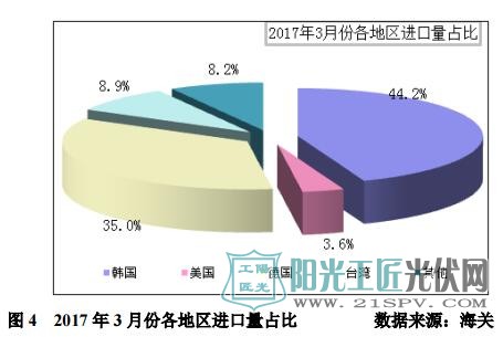 根据海关最新数据统计,2017年3月份多晶硅进口量为12529吨,环比增加14.5%,3月份进口均价15.75美元/千克,环比下滑3.7%。值得注意的有以下三点:第一,从韩国进口量仍位居第一。3月份从韩国进口量为5536吨,环比增加5.1%,占总进口量的44.2%,仍居进口量首位。3月份从韩国进口多晶硅量达到韩国月均产能的81.0%,韩国复审调查开始后截止目前尚未对韩国进口量产生影响。第二,自美国进口价格再次触底。3月份从美国进口价格跌至10.97美元/千克,环比下滑54.9%,接近2016您10月份的历史低点10.02美元/千克。3月份价格之所以跌幅巨大,主要是由于正逢国内外多晶硅市场需求低谷期,国内多晶硅价格一月之内跌幅达17.1%,在市场急速疲软的阶段,进口料价格也只能顺势下滑。第三,其他地区进口量日渐凸显。3月份从日本、马来西亚、以色列、印度共进口多晶硅1031吨,占总进口量的8.2%。其中马来西亚进口量达到701吨,占比为5.6%,超越美国成为第四大进口地区,另外还涌现出像以色列和印度等多晶硅出口国。