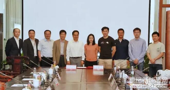 汉能控股集团董事局主席李河君(左5)摩拜单车创始人兼总裁胡玮炜(右5)出席签约仪式