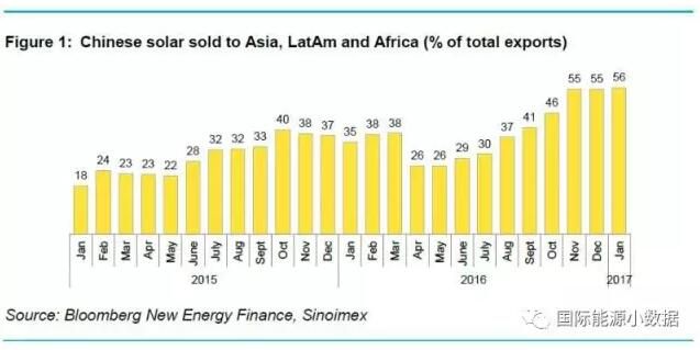 索比光伏网讯:中国光伏产品出口的主要市场已经开始从发达国家逐步转移到发展中国家。根据彭博新能源财经(BNEF)的数据,2017年1月份中国光伏产品对亚非拉的出口已经占到56%,而2015年1月这个份额仅为18%。