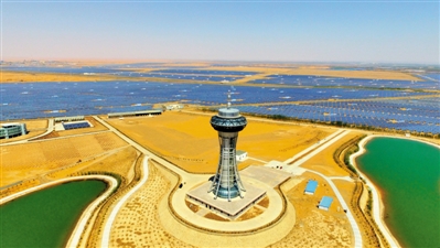 5月2日,沙漠、绿洲与一眼望不到边的太阳能光伏电板相映成画。位于腾格里沙漠南缘的中卫市沙漠光伏产业园规划面积6.5万亩,分光伏制造产业区、光伏发电区、光伏农业大棚区和观光旅游区4个规划区。产业园通过光伏产业和沙漠治理、节水农业相结合发展,实现了经济效益、社会效益、生态效益共赢。记者 王猛 实习生 马楠 王洋 摄