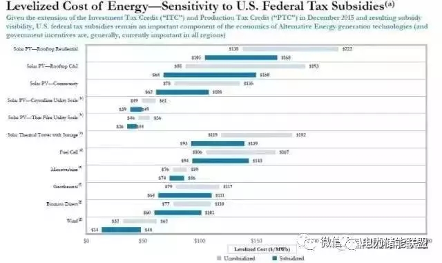 如果考虑联邦税收优惠,那么各类替代能源的全生命周期平准成本下降幅度可达30%: