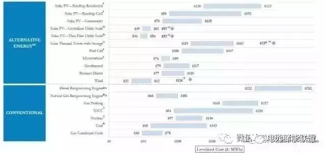 同时,美国咨询公司LAZARD日前也发布了储能技术成本的最新报告,披露不同储能技术在美国各类应用场景下(电网系统、削峰填谷、频率调节、配电网变电站、微电网、商业设施、家庭)的最新平准成本数据。