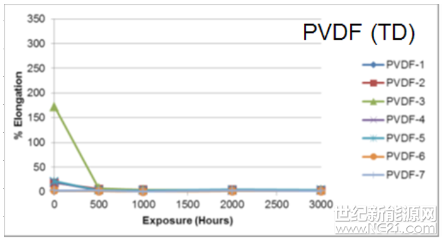 PVDF中加入大量PMMA后会影响薄膜的抗老化性能,主要表现为断裂伸长率低,一般低于30%。为了弥补这个缺陷,个别厂家在配方中添加弹性体以达到更高的测试结果。通过这两种成型工艺制备的薄膜在纵向有不同程度的拉伸,但在横向的拉伸都很弱或甚至没有拉伸,造成薄膜横向机械性能均较差,这也是目前为止PVDF薄膜从根本上较难解决的问题,面临着巨大的开裂风险。如下图1、图2摘自杜邦(中国)研发中心论文《光伏背板加速老化测试方法研究及相关国内外标准进展》。