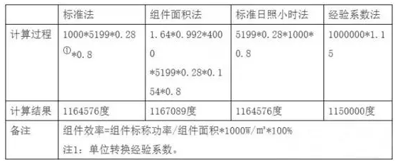 通过上述计算可以发现,标准法和标准日照小时法的得数是相同的,因为标准日照小时数的概念是这样定义的:辐照总量折算成在1000W/㎡的辐照下折算出的小时数,在数值上等于单位转换后的辐照量值。一般情况下,现场估算都是采用经验系数法,组织书面材料时,采用其他三种方法都可以。