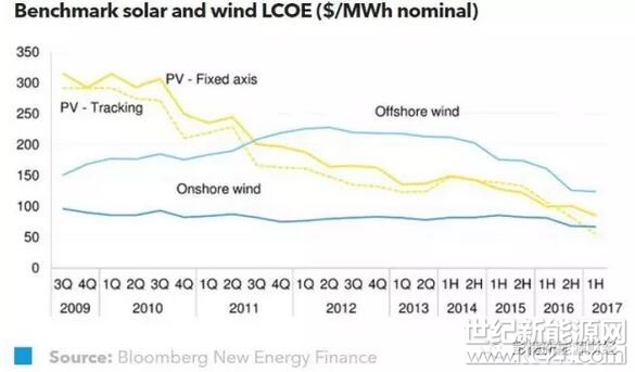 全球新增光伏项目成本持续下降:组件价格较2016年下降30%;发达国家运维成本及融资成本都在下降。2017年上半年,我们认为全球标杆(fix-axis)光伏度电成本已经从2016年下半年的$100/MWh下降至$86/MWh,(single-axis)光伏度电成本更是下降33%,至$56/MWh。我们的分析首次表明:带有追踪器的光伏系统度电成本可以降至比陆上风电更低的水平。
