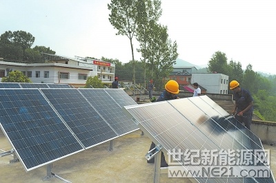 施工人员正在给贫困户在房顶安装太阳能发电板石雪帆摄
