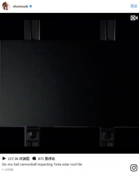 这段视频由马斯克在个人Instagram上公布。视频中,一块大冰雹--至于究竟有多大就不知晓了,不过特斯拉将它叫做“炮弹”,然后以非常快的速度撞向屋顶瓦片,最后,冰雹裂成了成千上万块小冰块,而屋顶瓦片看起来完全没有损坏。