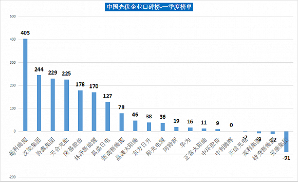 一季度,20家光伏样本企业口碑总分值为1715。非常可惜的是,由于光伏企业口碑榜推出较晚,我们没有同比数据可供参考。但以我们的经验而言,这个数值并不低。