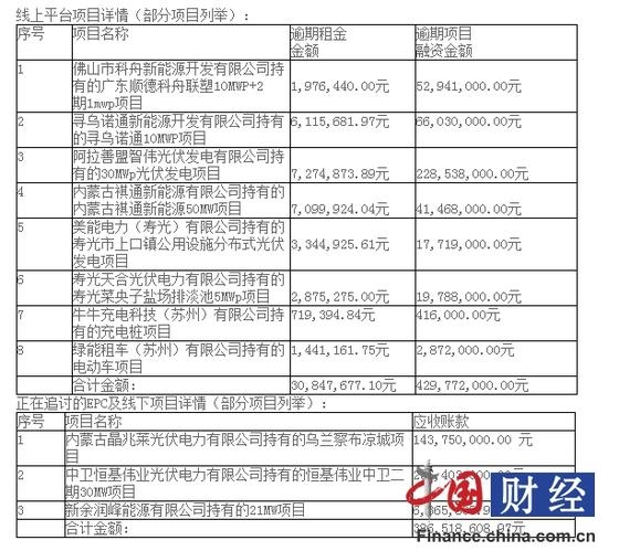 公示指出,因光伏补贴延迟等原因,致使目前平台提现出现逾期现象。截至目前,平台逾期支付租金总计2.22亿元,涉及线上投资人5746人,逾期项目融资总额4.30亿元。