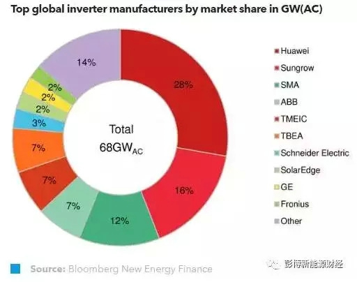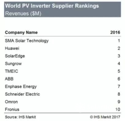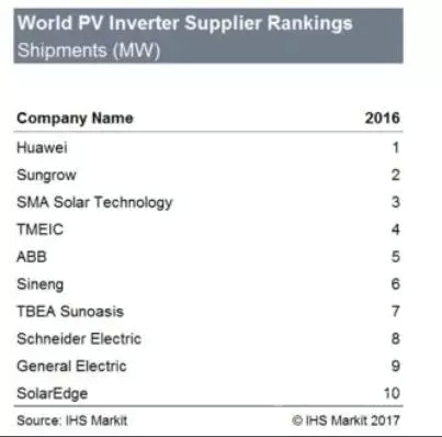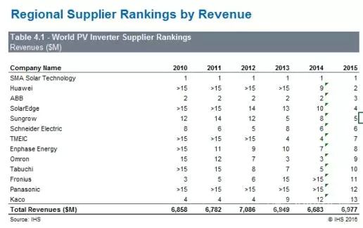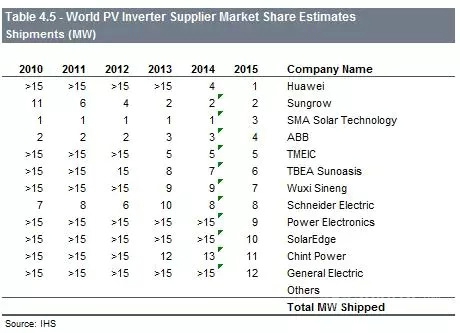 这个出货量似乎并没有写明具体的出货数据,不知道原文对IHS的榜单数据截屏造成的,还是什么其他原因?华为或者某些公司,能给个说法么?从榜单看,华为和阳光是第一、第二,SMA第三,出货量排名仍是第三位,TMEIC(日本东芝三菱)到了老四,ABB为第五。后面还是有一堆著名的公司,施耐德电气、通用电气和SolarEdge。2015年的数据是啥样的?