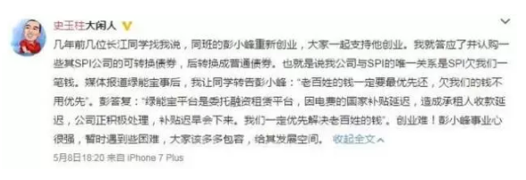 值得一提的是,此前恒大集团徐家印、巨人网络CEO史玉柱、青云创投叶东等人的名字都挂在绿能宝网站上,是其股东阵容,也是作为国内多位顶级商业领袖为绿能宝保驾护航。而绿能宝兑付危机出来后,部分网友通过微博质疑史玉柱为绿能宝站台,使得史玉柱紧急澄清。
