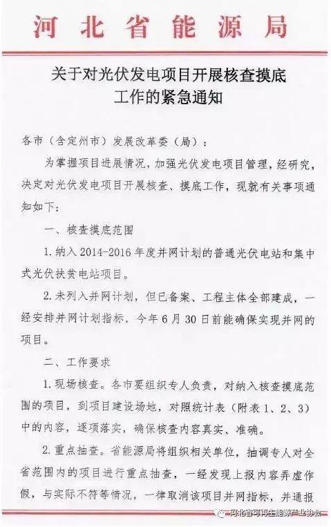 索比光伏网讯:通知要求:各地市发改委对纳入2014-2016年并网计划的普通光伏电站和集中式扶贫电站以及未列入并网计划、但已备案、工程主体全部建成、630前能确保并网的项目进行全面现场核查以及重点抽查。一经发现弄虚作假,与实际情况不符的情况,一律取消该项目并网指标,并通报批评和追责!