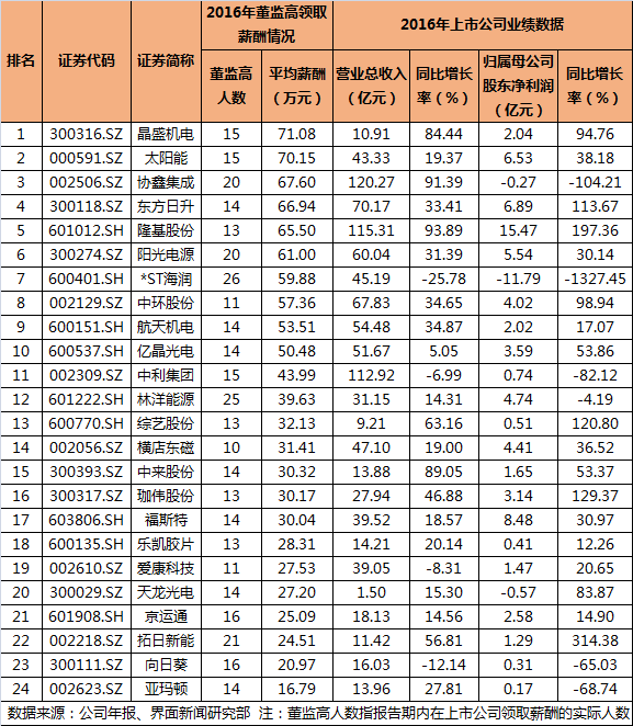 随着2016年年报披露落下帷幕,光伏类上市公司在去年的薪酬情况悉数公示。界面新闻依据24家A股光伏企业年报披露的信息,整理出了一份A股光伏企业薪酬榜,分别按照董监高平均薪酬以及员工平均薪酬进行排序。