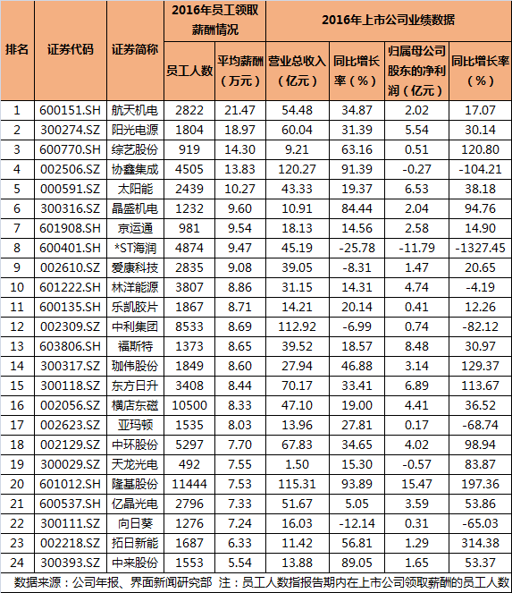 在上述24家A股光伏企业中,2016年员工平均工资超过10万元的共计5家,分别为航天机电、阳光电源、综艺股份、协鑫集成以及太阳能。其中,航天机电员工去年平均薪酬高达21.47万元,独占鳌头。而相较之下,中来股份员工去年的平均薪酬为5.54万元,仅是航天机电的1/4。