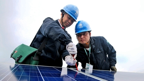 图为:5月15日,浦城县供电公司仙阳供电所员工为晶源发电企业义务检查电池板线路、电池板安装情况等。(李义友 叶凌云)