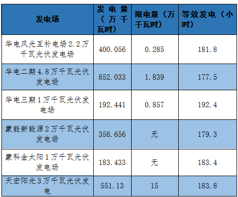 二、二连浩特市光伏电场4月份发电情况2017年4月份,二连浩特市光伏发电量为2537.749万千瓦时,同比增长28.47%,环比下降4.28%,等效发电小时约181.3小时,限发电量17.981万千瓦时。其中,华电风光互补电场2.2万千瓦光伏发电场发电量为400.056万千瓦时,限电量为0.285万千瓦时,等效发电小时约181.8小时。华电二期4.8万千瓦光伏发电场发电量为852.033万千瓦时,限电量为1.839万千瓦时,等效发电小时约177.5小时。华电三期1万千瓦光伏发电场发电量为192.441万千瓦时,限电量为0.857万千瓦时,等效发电小时约192.4小时,为二连浩特市光伏等效发电小时数最高。蒙能新能源2万千瓦光伏发电场发电量为358.656万千瓦时,无限发电量,等效发电小时约179.3小时。蒙科金太阳1万千瓦光伏发电场发电量为183.433万千瓦时,无限发电量,等效发电小时约183.4小时。天宏阳光3万千瓦光伏发电场发电量为551.13万千瓦时,限发电量15万千瓦时,等效发电小时约183.8小时。