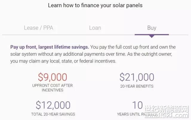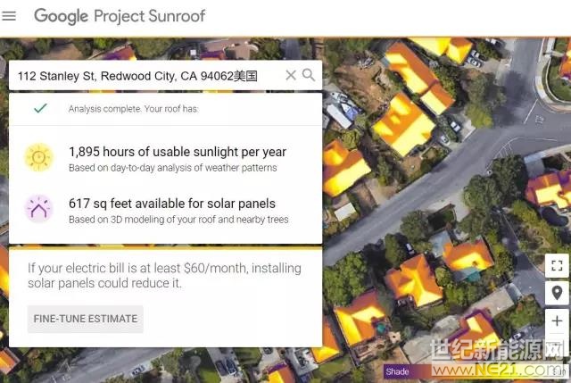 以图中的美国用户地址为例,每年有1895小时的可用阳光资源,可用屋顶面积617平方英尺,如果用户每月电力账单不低于60美金,安装屋顶光伏长期来看就可以节省电费。