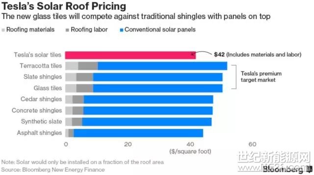 据彭博新能源财经BNEF,特斯拉光伏瓦片的单位成本为大约42美金/平方英尺,较之前该机构预测的68美金/平方英尺更低。而相较之下,普通瓦片的单位成本为11美金/平方英尺。下图为特斯拉光伏屋顶和普通屋顶加装光伏电板的单位成本比较。