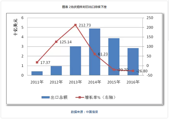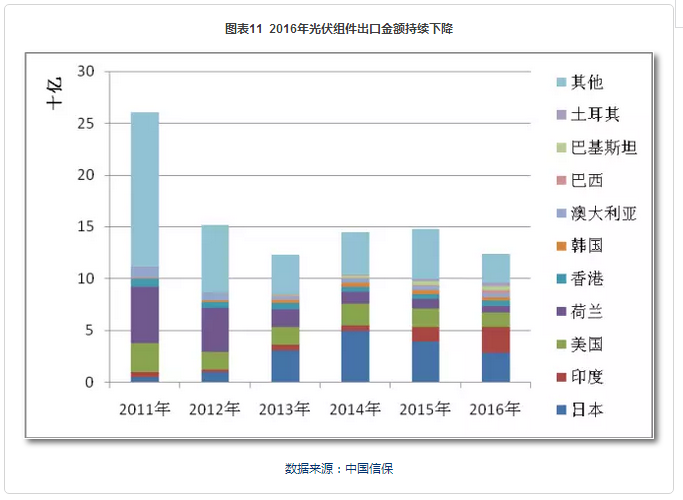 日本仍为我国光伏组件出口的第一大市场,但2016年,我国对日光伏组件出口金额28.34亿美元,较2015年同比下滑26.80%。