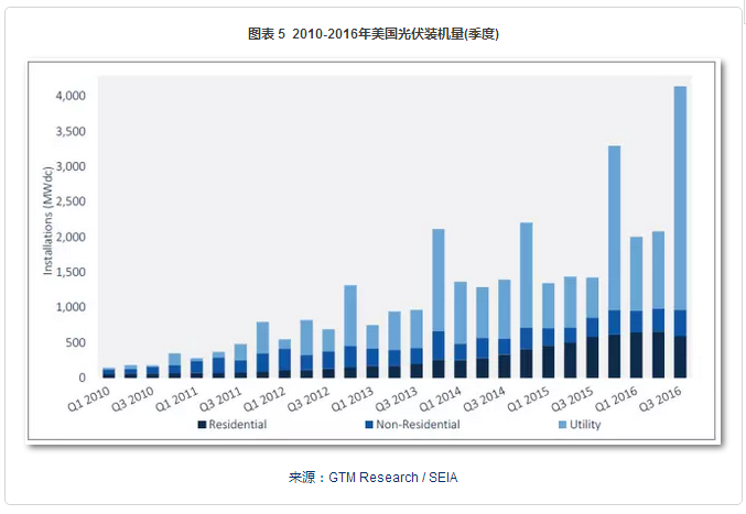 根据GTM和SEIA联合发布的数据显示,2016年美国新增光伏装机达到14.76GW,同比增长了97%,堪称“光伏大跃进”。这一年,美国规模化的光伏装机自2011年以来首次超过了居民屋顶光伏装机(2.583GW)。