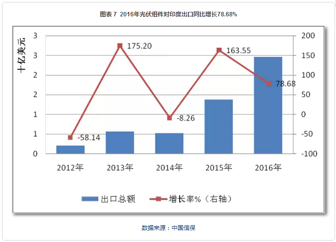 印度在2016年一跃成为我国光伏组件出口的第二大市场,2016年,我国对印度光伏组件出口金额24.59亿美元,较2015年同比增长78.68%。