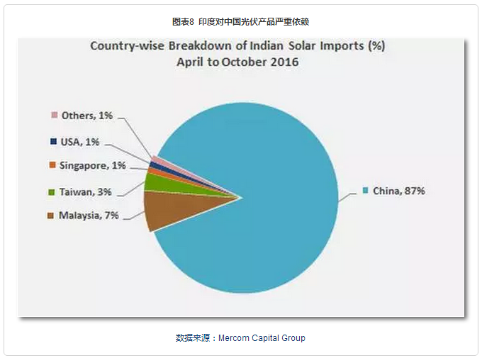 在我国光伏组件对印出口大幅上升的同时,印度光伏行业对中国产品的依赖度也在上升,据印度商务部统计,在2016年4-10月期间,在印度光伏产品进口来源国中,中国产品已经占据了87%的市场,其次为马来西亚,但占比仅7%,排在第三位的中国台湾,占比也仅有3%。