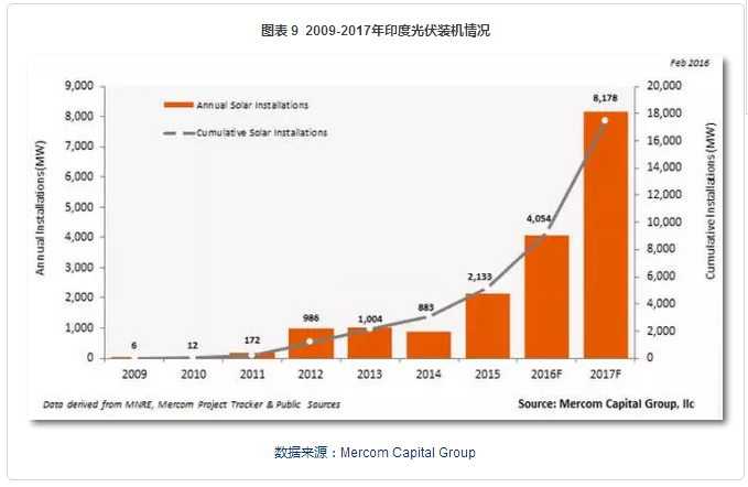 据印度新能源与再生能源部(NMRE)统计的数据显示,截至2016年12月31日,全国太阳能装机量达9,012MW,正式突破9GW大关;装机量超过500MW的地区分别是:坦米尔纳杜邦(1,591MW)、拉贾斯坦邦(1,318MW)、古吉拉特邦(1,159MW)、安德拉邦(980MW)、特伦甘纳邦(973MW)、中央邦(840MW)、旁遮普省(545MW)。