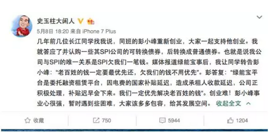 SPI成立后,以前真的不怎么出来讲话的彭小峰奔波于每一场业内活动,为了绿能宝,他坚持发红包都用绿能宝的券。