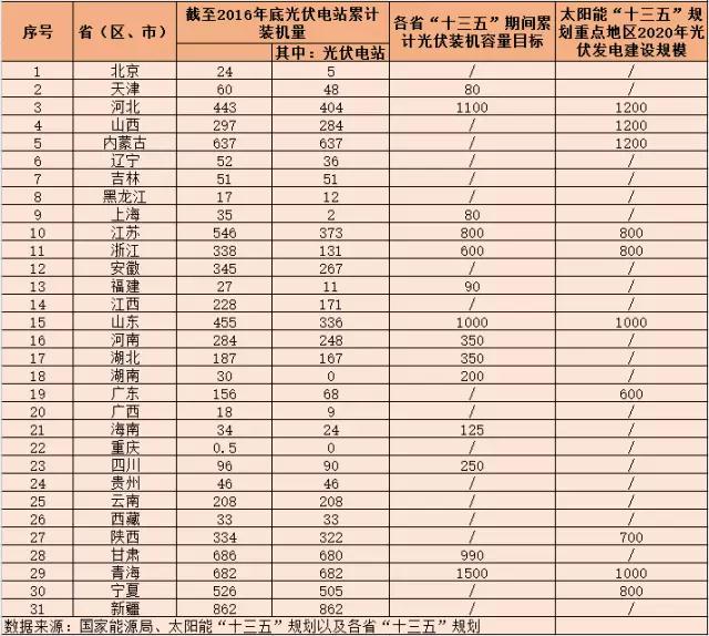 注:1、上表参考了国家能源局官网数据、太阳能“十三五”规划以及各省的相关“十三五”规划中关于光伏电站装机目标容量制定,信息仅供参考分析。