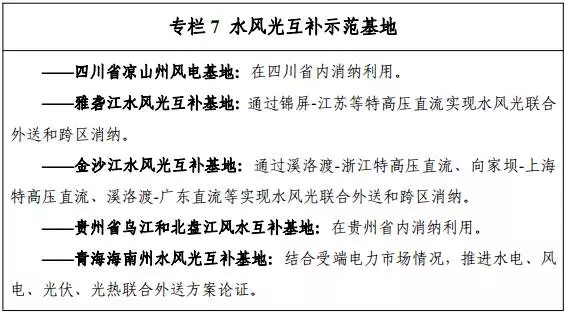 ——开展水风光互补基地示范。利用水风光发电出力的互补特性,在不增加弃水的前提下,在西南和西北等水能资源丰富的地区,借助水电站外送通道和灵活调节能力,建设配套的风电和光伏发电项目,协同推进水风光互补示范项目建设。重点推进四川省凉山州风水互补基地、雅砻江水风光互补基地、金沙江水风光互补基地、贵州省乌江和北盘江流域风水联合运行、青海海南州水风光互补基地等可再生能源基地建设。
