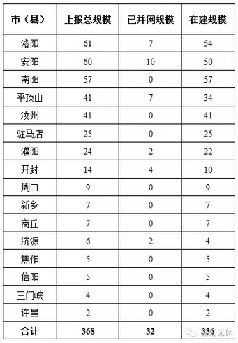 2016年11月3日,河南省《2016年三季度河南省光伏电站建设情况》,介绍了河南省2016年前三季度的光伏电站建设情况: