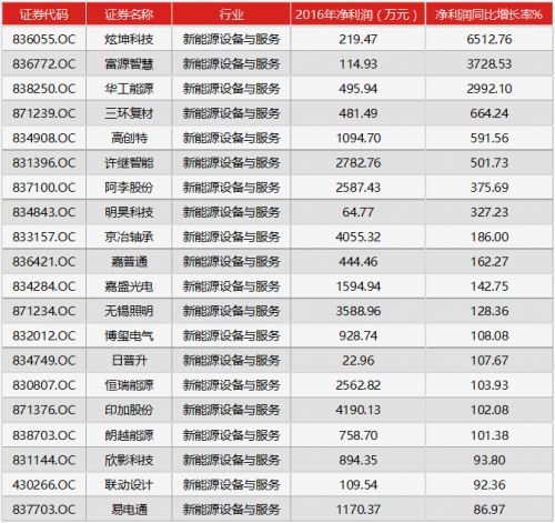 以下为2016年新能源设备与服务行业新三板公司净利润增长率Top20名单: