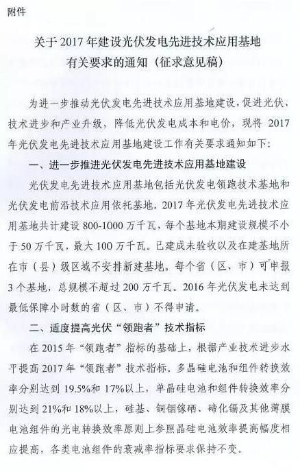 索比光伏网讯:国家能源局综合司于近日印发《关于2017年建设光伏发电先进技术应用基地有关要求的通知》(征求意见稿),指出2017年光伏发电先进技术应用基地共计建设8-10GW,每个基地本期建设规模不小于500MW,最大1GW。已建成未验收以及在建基地所在市(县)级区域不安排新建基地。每个省(区、市)可申报3个基地,总规模不超过2GW。2016年光伏发电未达到最低保障小时数的省(区、市)不得申请。