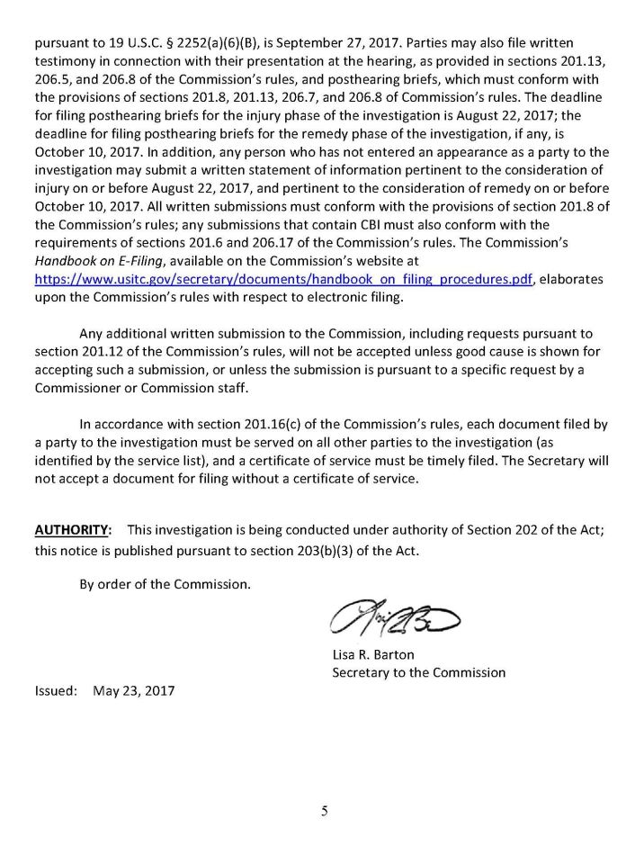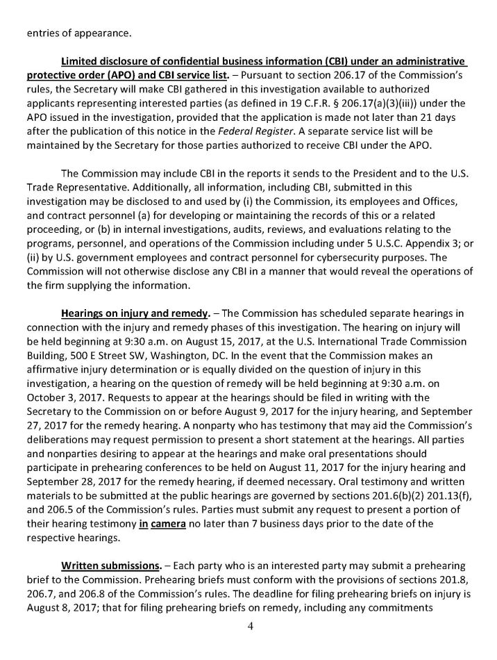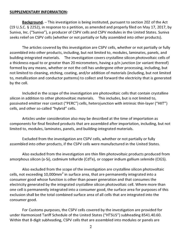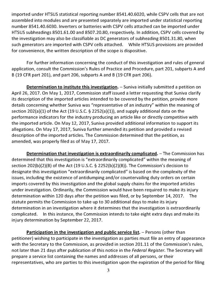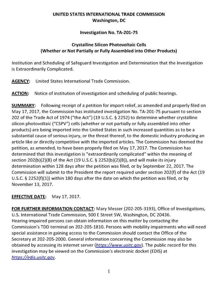 美国东部时间2017年5月23日,美国国际贸易委员会发布公告,称应国内光伏企业Suniva申请,对全球光伏电池及组件发起保障措施调查(“201”调查)。公告称,由于案情复杂,将延期至30天至9月22日作出损害认定,并在11月22日前向总统提交调查报告。