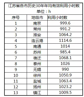 表 4:江苏各地级市的年均有效利用小时数(单位:h)
