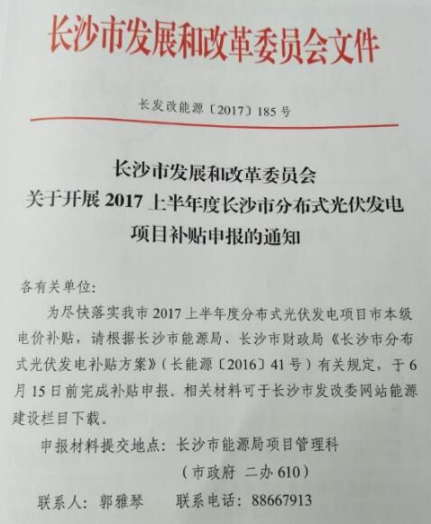 原标题:长沙市发展和改革委员会关于开展2017上半年度长沙市分布式光伏发电项目补贴申报的通知