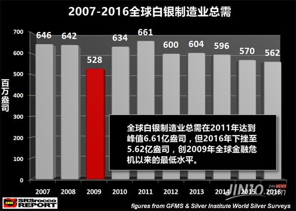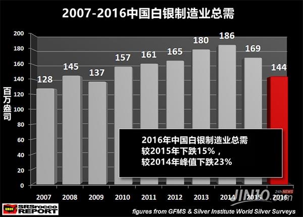 此外,中国白银制造业总需下跌23%,较2014年高峰的1.86亿盎司减少4200万盎司。有人认为中国工业用银减少与银价上涨有关,但这种解释似乎不具有说服力,毕竟2014年平均白银价格高达19.08美元/盎司(2015年为15.68美元/盎司,去年则为17.14美元/盎司)时,中国的工业白银消费量也要大得多。这意味着中国工业用银数量与银价之间并没有必要的联系,背后暗藏着更加可怕的趋势。