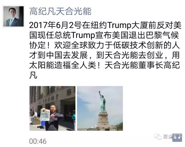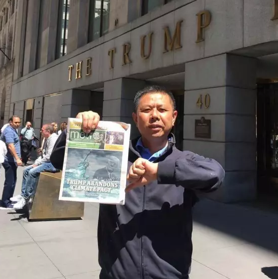 “2017年6月2号在纽约Trump大厦前反对美国现任总统Trump宣布美国退出巴黎气候协定!欢迎全球致力于低碳技术创新的人才到中国去发展,到天合光能去创业,用太阳能造福全人类!天合光能董事长高纪凡”