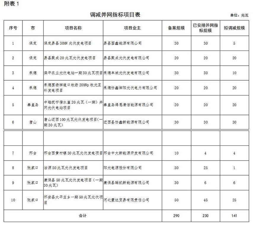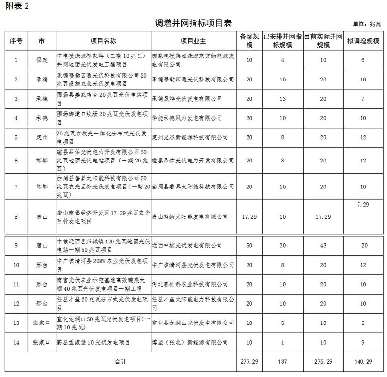 原标题:河北省2016年普通光伏发电项目并网指标调整情况公示