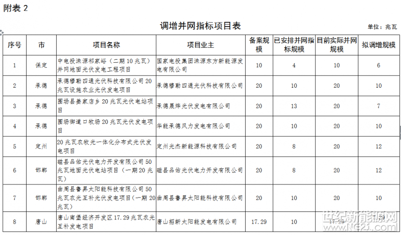 对部分规模已列入并网计划,全部备案规模已于5月18日前并网发电,但指标仍有缺口的项目,予以补齐并网指标。符合上述要求的项目共14个,安排并网指标14.029万千瓦(附表2)。本次调增指标上网电价,均按2016年第三批普通光伏电站项目平均降低0.143元/千瓦时执行。
