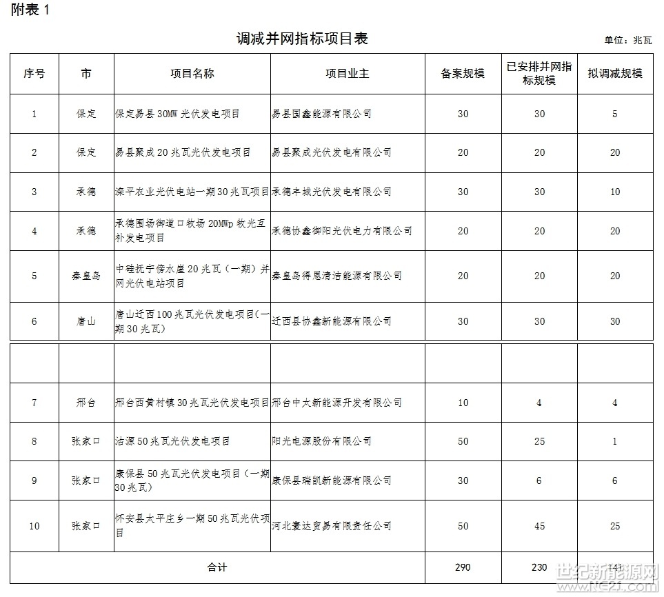 附表:1.调减并网指标项目表