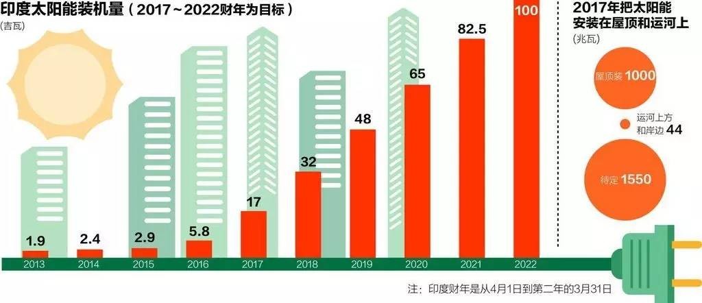 早在2014年,印度总理莫迪宣布了一个计划:到2022年,印度要实现100GW的太阳能装机容量。