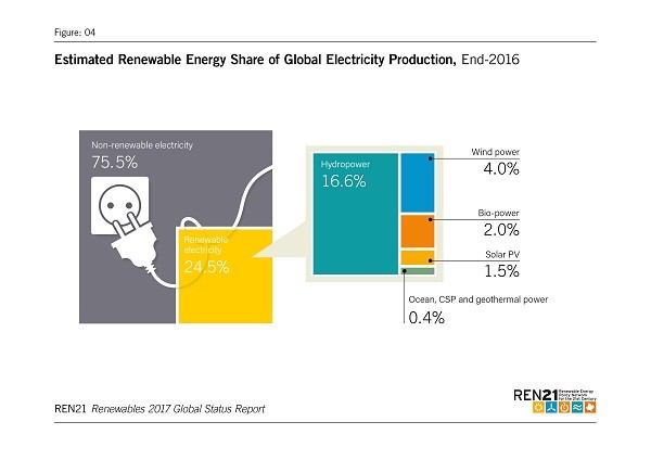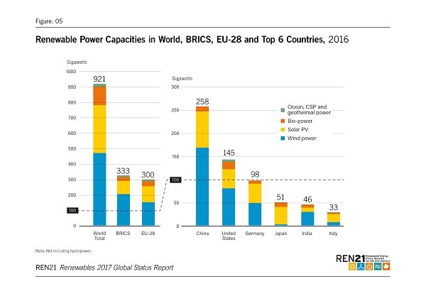 REN21在最新报告《2017年全球再生能源状态报告》(GSR2017:Renewable 2017 Global Status Report)中指出,2016年,全球共新增了161GW的再生能源发电设备,其中47%为太阳能,34%为风力。至2016年底,全球再生能源累计装机量达到2,017GW。累计装机量最高的是中国,达258GW;美国次之,为145GW。