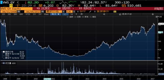 经过5年的组件价格下跌,最终风电组件的价格稳定在3.8元/W(这几年都没怎么大的波动)。而维斯塔斯由于随后几年不需要太多新的资本投入,技术进步带来毛利率和净利润率的改善,使得VWS的roe不断提高,从2009年的6.05%到2014年的20%,再到2016年的32%,其股价也接近创新高。