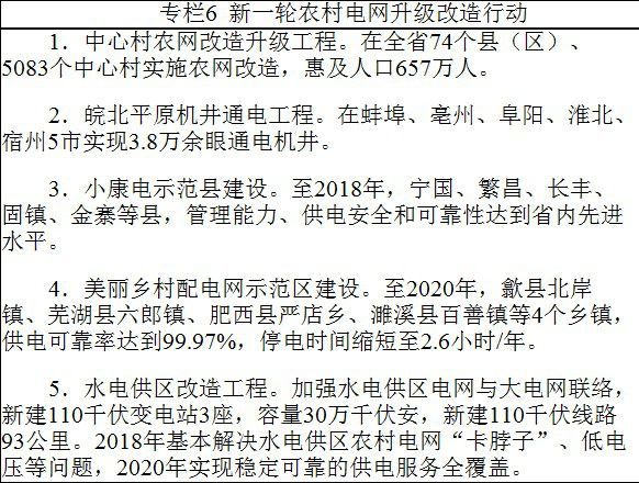 实施新一轮农网升级改造工程。加大农网改造升级力度,推进城乡供电服务均等化进程,逐步提高农村电网信息化、自动化、智能化水平。完成农村机井通电、中心村电网改造升级和小康电示范县建设任务。2017年,完成全部中心村农网升级改造,实现村村通动力电、皖北地区机井通电全覆盖。2018年,完成小康电示范县建设,为全省农网改造升级工程树立标杆。2020年,太湖、霍山等6县水电供区农网各项指标达到全省平均水平。积极跟踪美丽乡村建设进度,同步开展美丽乡村电力设施改造,推进城乡电网建设一体化。
