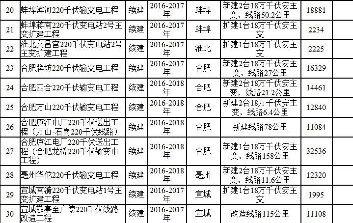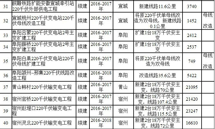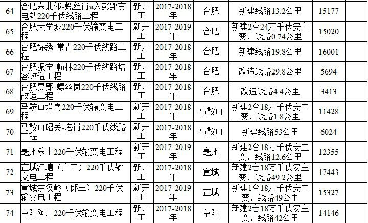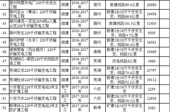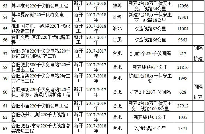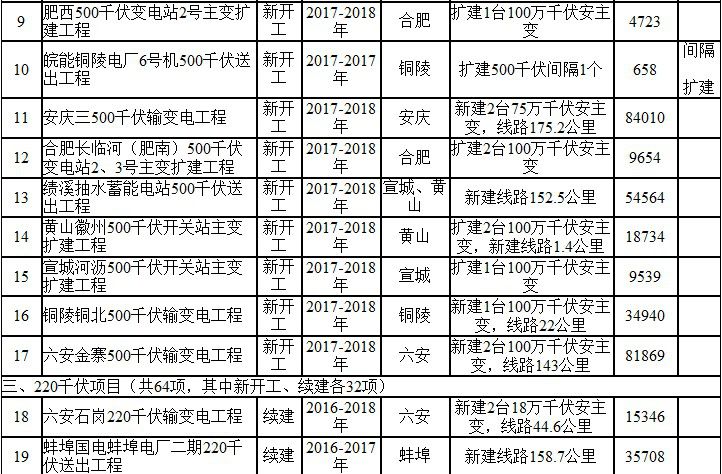 2017年安徽电网220千伏及以上建设项目表