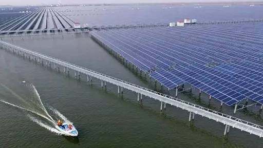 位于鄱阳湖畔的江西都昌县矶山湖“渔光一体”光伏项目,该项目装机容量80MW,总投资6.4亿元,利用矶山湖水产场部分保水保肥能力差的沙质鱼池,架设光伏板进行光伏发电,实行水上发电,水下养鱼的模式,提高水面资源的利用效率。